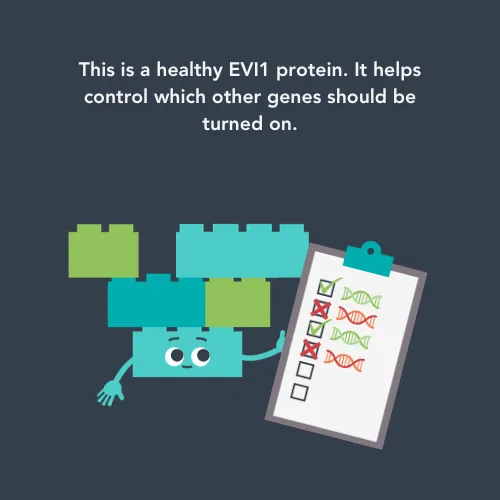 EVI1 is present in some healthy cells too, where it can help maintain the balance between different types of blood cells and ensure that these cells develop properly. Different types of cells need different genes active, so the EVI1 protein can turn a lot of different genes on and off. Whilst this is all important in healthy cells, this amount of power can be dangerous when things go wrong.