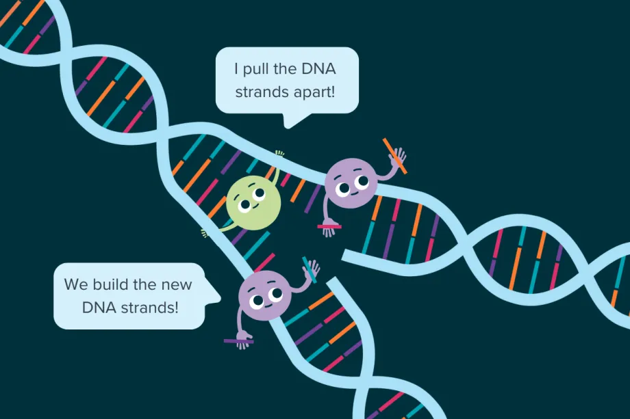 When making new cells, whether cancerous or healthy, a cell undergoes a number of changes that lead to it splitting into two cells. One of the first steps is copying the genetic code in the cell so that there are two copies of the instructions – one for each new cell. To copy the DNA, the two strands need to be split apart.