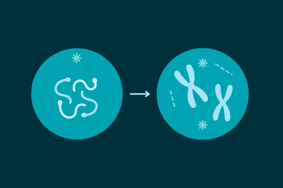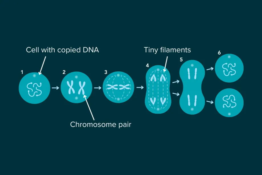 In cell division, copied DNA gets wound up into chromosomes. Then, tiny filaments line the chromosomes up along the centre of the cell and split them in half. This ensures that each new cell has a full copy of the DNA. The cell then splits in half.