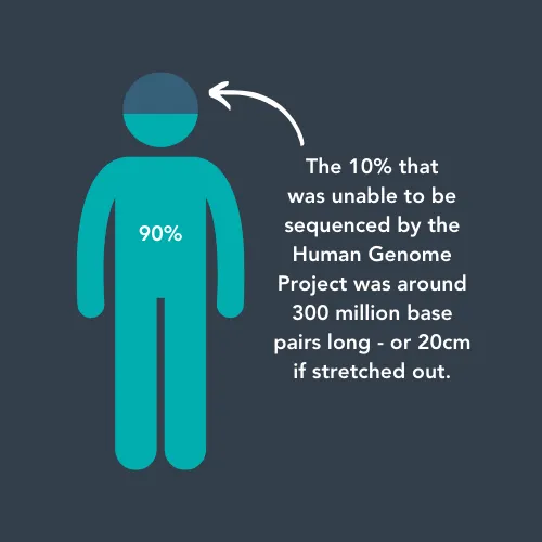 When the first human genome was sequenced in 2003 after 13 years and $2.7 billion, it was not actually fully complete. About 10% of the DNA found in our cells was not sequenced, partly due to the dim view of ‘junk DNA’ and partly because the technology at the time wasn’t good enough to sequence it.