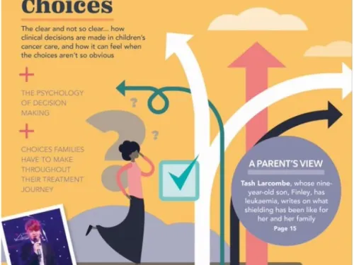 Contact is now 20 pages full of interesting features, thoughts, ideas and information for all those affected by childhood cancer. Our first issue covers the theme of ‘Choices’. Our lives are made up of an infinite amount of choices that we make every day. Making a choice with confidence based on the options we have at the time is the only sensible thing we can do and sometimes there is no right or wrong, just different. In this issue, we look at the choices faced by families and professionals while caring for and treating a child with cancer.